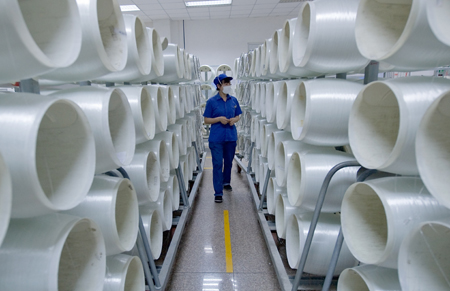 圖為一名工作人員從玻纖半成品車間走過(guò)。(新華社發(fā))