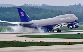 美國(guó)聯(lián)合航空公司N184UA號(hào)波音747-400客機(jī)著陸北京首都國(guó)際機(jī)場(chǎng)。資料圖片 |