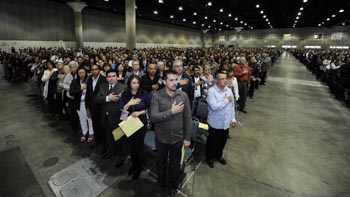 10月27日,在美國洛杉磯,新移民在南加州地區(qū)公民入籍儀式上宣誓成為美國公民。記者