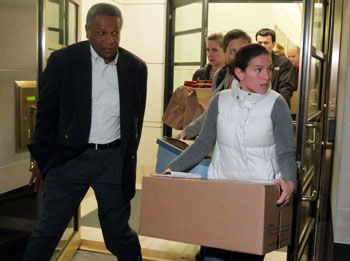 11月22日,F(xiàn)BI的工作人員突襲檢查了美國三家對沖基金的辦公室,并帶走了成箱的文件。這三家公司被認為與一樁內(nèi)幕交易案件有關(guān)。圖為執(zhí)法人員搬走印有“證據(jù)”字樣的箱子。(路透社) |