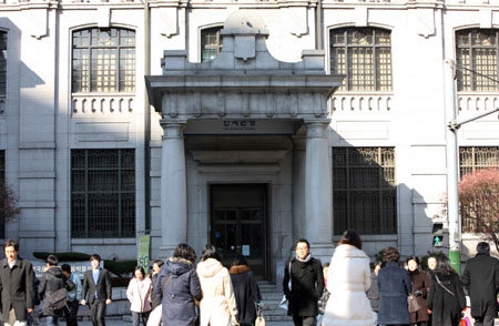12月9日,在韓國首都首爾,人們走過韓國銀行門口。