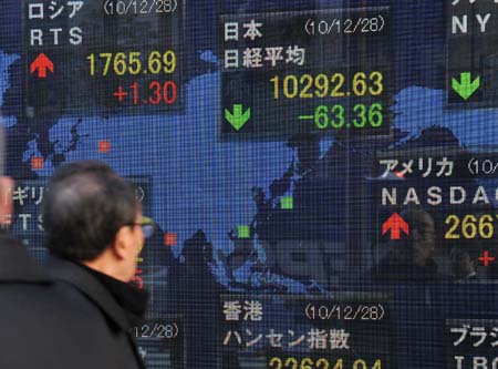 12月28日,在日本東京,一名行人從股市信息顯示屏前走過。當(dāng)日,受獲利了結(jié)等因素影響,東京股市日經(jīng)225種股票平均價格指數(shù)下跌63.36點,收于10292.63點,跌幅0.61%。