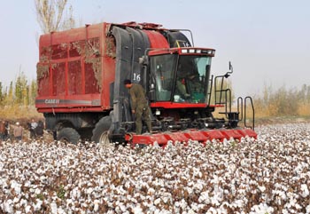 如今,阿拉爾墾區(qū)有近1/3的棉田都靠機械采摘,自從新疆進行了大面積棉花機械化采摘作業(yè)的有益嘗試,實施機械化采摘棉花,不僅達到了團場增效、職工增收的目的,而且從根本上改變了以往拾花季節(jié)市區(qū)機關(guān)停止辦公、工廠停工、商店停業(yè)、中小學(xué)停課,全部下團場采摘棉花的情況。更為重要的是,利用這種機械不僅減輕采摘棉花的繁重勞動,還降低了人工采棉成本。據(jù)張樂測算,使用機械采摘棉花,每公斤的費用不到0.6元,不到人工采摘的1/3。