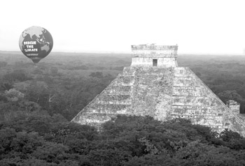 11月28日,在墨西哥坎昆的奇琴伊查瑪雅古城遺址旁,綠色和平組織升起一個(gè)巨大的熱氣球,呼吁人們保護(hù)環(huán)境。新華社發(fā)(普羅梅特奧·盧賽羅