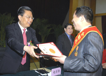 省委書記、省人大常委會(huì)主任趙樂際為獲得全國五一勞動(dòng)獎(jiǎng)?wù)碌氖∴]政公司總經(jīng)理馬鳳炯頒獎(jiǎng)。 |