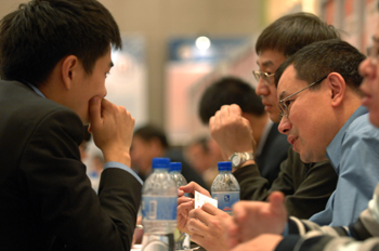 一名留學德國的創(chuàng)業(yè)項目負責人(右)在洽談會現(xiàn)場向國內一家企業(yè)代表推介帶來的芯片開發(fā)技術項目!⌒氯A社記者 黃宗治