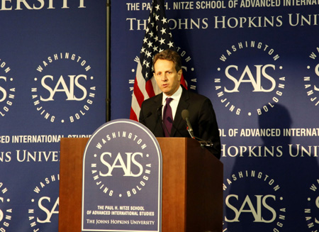 1月12日,美國(guó)財(cái)政部長(zhǎng)蓋特納在華盛頓發(fā)表演講。