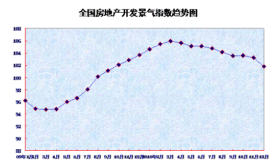 12月份,全國(guó)房地產(chǎn)開(kāi)發(fā)景氣指數(shù)(簡(jiǎn)稱“國(guó)房景氣指數(shù)”)為101.79,比11月份回落1.41點(diǎn),比上年同期回落1.87點(diǎn)。