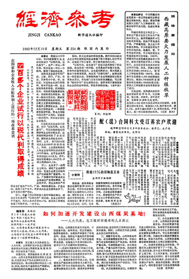 下邊的這張報(bào)樣是1982年12月10日《經(jīng)濟(jì)參考》(《經(jīng)濟(jì)參考報(bào)》前身)的一版,細(xì)心的讀者可能會(huì)發(fā)現(xiàn)在靠近頭版頭條的位置有兩枚篆刻印章,內(nèi)容是“慶祝五屆人大五次會(huì)議勝利閉幕”以及“熱烈歡呼新憲法莊嚴(yán)誕生”。1981年7月1日創(chuàng)刊的《經(jīng)濟(jì)參考報(bào)》正是以這種獨(dú)特的形式第一次報(bào)道了兩會(huì)。