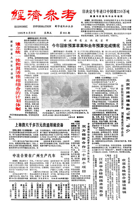 1985年3月29日的頭版,《經(jīng)濟(jì)參考報(bào)》刊登了當(dāng)時的財(cái)政部部長王丙乾,在六屆全國人大三次會議上宣讀的“關(guān)于1984年國家預(yù)算執(zhí)行情況和1985年國家預(yù)算草案的報(bào)告”的報(bào)道。這一天,對于《經(jīng)濟(jì)參考報(bào)》來說是特殊的,因?yàn)檫@是本報(bào)關(guān)于“國家預(yù)算執(zhí)行情況和國家預(yù)算草案報(bào)告”的首次報(bào)道。