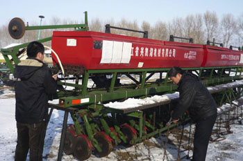 黑龍江墾區(qū)建設(shè)農(nóng)場第二管理區(qū)農(nóng)機(jī)工人在調(diào)試播種機(jī)。新華社發(fā)(周良君
