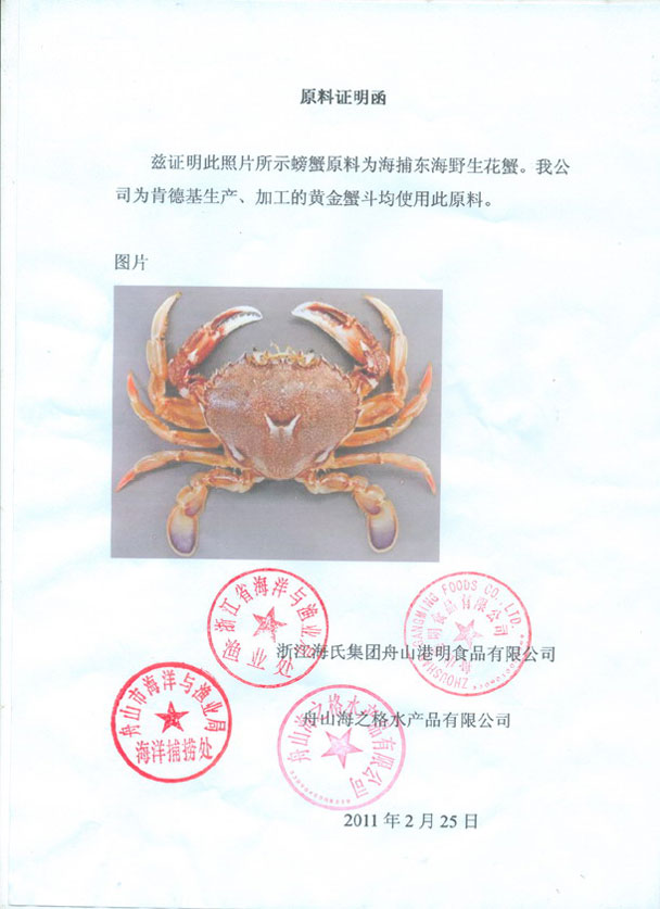 肯德基黃金蟹斗供應(yīng)商出具的原料證明