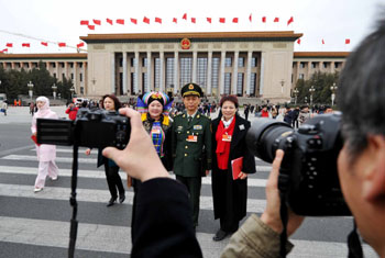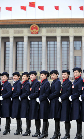 兩會(huì)服務(wù)人員在人民大會(huì)堂外合影留念。