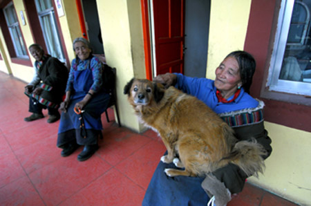 3月,甘肅省甘南藏族自治州草原上的草仍然枯黃,道路旁的冰雪還沒有完全融化。在夏河縣科才鄉(xiāng)農牧村敬老院里,藏族老夫婦貢保和阿仲以及其他幾位藏族老人,坐在暖和的玻璃走廊里,一邊轉著佛珠一邊曬太陽,他們養(yǎng)的大黃狗“扎西”溫順地依偎在腳旁。