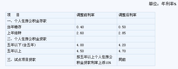 一、從2011年4月6日起,上調個人住房公積金存款利率。當年歸集的個人住房公積金存款利率上調0.1個百分點,由0.40%上調至0.50%;上年結轉的個人住房公積金存款利率上調0.25個百分點,由2.60%上調至2.85%。