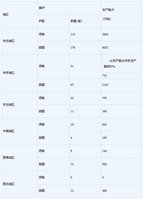 3.55億噸,其中晉、冀、魯三省的總產(chǎn)量超過1.56億噸,占全國總量的44.2%,如再加上內(nèi)蒙古、河南,五省的焦炭總產(chǎn)量達1.96億噸,超過國內(nèi)總產(chǎn)量的55.5%。 如按獨立焦化企業(yè)計算,截至到2009年,我國規(guī)模以上的獨立焦化企業(yè)共有195家,焦?fàn)t464座,產(chǎn)能合計1.56億噸。其中,華北地區(qū)焦化企業(yè)122家,焦?fàn)t289座,設(shè)計產(chǎn)能9711萬噸,分別占企業(yè)總數(shù)、焦?fàn)t總數(shù)和獨立焦化總產(chǎn)能的62.56%、62.28%和62.25%。其中,山西(91家企業(yè)、98座焦?fàn)t、7251萬噸產(chǎn)能)、河北(23家企業(yè)、25座焦?fàn)t、2252.6萬噸產(chǎn)能)兩省占華北地區(qū)總產(chǎn)能的97.86%;華東地區(qū)共有焦化企業(yè)35家、焦?fàn)t88座、產(chǎn)能2830萬噸,分別占各自總量的17.95%、18.97%和18.14%,是我國第二大獨立焦化企業(yè)聚集區(qū)。其中,有31家企業(yè)的84座焦?fàn)t分布在山東省,占華東地區(qū)總產(chǎn)能的87%。
