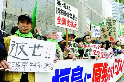 當(dāng)日,日本200多名農(nóng)民在東電總部外示威,要求東京電力公司補(bǔ)償因福島第一核電站事故造成的損失。