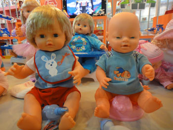 “哇,好萌!”在驊威公司的展廳里,一個(gè)來(lái)參觀的女孩被模樣超級(jí)可愛(ài)的娃娃們吸引住了!斑@些娃娃,可不單是可愛(ài)哦。他們都是智能娃娃,可以溜冰吹泡泡,會(huì)拉屎撒尿。”設(shè)計(jì)師劉元學(xué)現(xiàn)場(chǎng)為參觀者演示了一個(gè)會(huì)“發(fā)燒”的娃娃。只見(jiàn)這個(gè)娃娃“發(fā)燒”之后,滿臉通紅,給它喂各種藥還不夠,仍哭鬧不停,只好給它“打針”“打針”之后,退燒了,它的臉色才恢復(fù)了正常。
