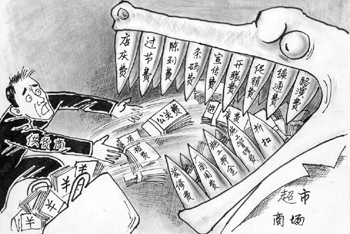 類(lèi)似的情況并不僅僅發(fā)生在商場(chǎng)。在頗費(fèi)了一番周折之后,國(guó)內(nèi)一家食品公司的銷(xiāo)售部負(fù)責(zé)人小王(化名)終于同意和《經(jīng)濟(jì)參考報(bào)》記者聊一聊!艾F(xiàn)在我們對(duì)超市收費(fèi)都是敢怒不敢言”,采訪中他再三強(qiáng)調(diào),“千萬(wàn)不要寫(xiě)得太清楚,不然以后生意沒(méi)得做了!