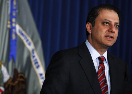 圖為曼哈頓地區(qū)檢察官普里特·巴拉拉出席在美國紐約的新聞發(fā)布會。