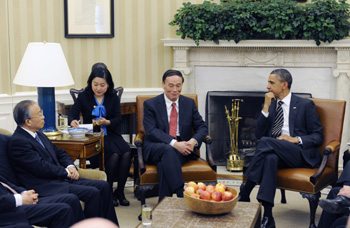 5月9日,美國總統(tǒng)奧巴馬在華盛頓白宮會見正在當(dāng)?shù)爻鱿谌喼忻缿?zhàn)略與經(jīng)濟對話的中國國家主席胡錦濤特別代表國務(wù)院副總理王岐山、國務(wù)委員戴秉國。新華社記者