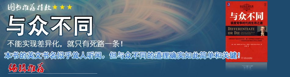 | 在這個極度競爭的世界中,在全球經(jīng)濟(jì)深刻劇變的年代中,誰敢保證自己的企業(yè)能生存下來,甚至活得更好?本書的英文書名似乎聳人聽聞,但與眾不同的道理確實如此簡單和關(guān)鍵。本書將幫助困境中的企業(yè),通過許多生動的故事,包括來自中國的案例,講解實施差異化的方法。用特勞特先生對中國企業(yè)的話來講:如果你的產(chǎn)品是差異化的,整個世界就會為你敞開大門。