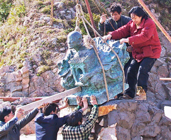 朱仁民在舟山普陀海洋雕塑公園(右一)與民工一起安裝日僧慧鍔銅像。新華社發(fā) |