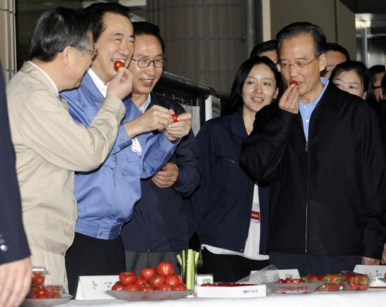 下午,溫家寶和日本首相菅直人、韓國(guó)總統(tǒng)李明博一同訪問了福島縣福島市。在接待室里,菅直人請(qǐng)溫家寶和李明博一起品嘗了福島縣出產(chǎn)的櫻桃和小番茄。
