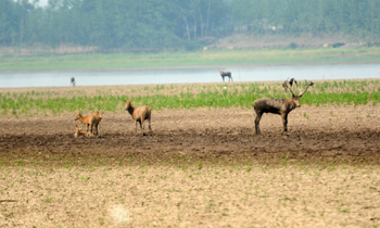 湖北石首麋鹿國(guó)家級(jí)自然保護(hù)區(qū)位于長(zhǎng)江新舊河道的夾角處,總面積2.3萬畝。目前,生活在這里的近400頭麋鹿正遭受著前所未有的干旱危機(jī)。正處發(fā)情交配期的麋鹿,沒有適合發(fā)情交配的沼澤環(huán)境,可能推遲交配,甚至不交配。干旱還會(huì)導(dǎo)致保護(hù)區(qū)內(nèi)的濕地旱化,給麋鹿的草料、食物及生存帶來困難。為保證麋鹿飲水,保護(hù)區(qū)已修建30多個(gè)水槽,定期加水供麋鹿飲用。圖為幾只麋鹿在石首麋鹿國(guó)家級(jí)自然保護(hù)區(qū)內(nèi)覓食。記者