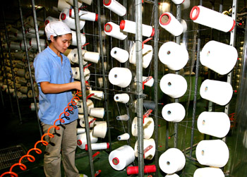 圖為上海崇明島上的飛逸紡織廠員工正在生產(chǎn)線上忙碌。記者