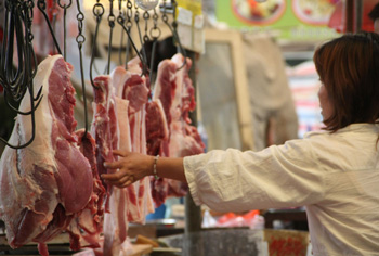 6月14日,市民在青島一農(nóng)貿(mào)市場購買豬肉。新華社發(fā)(黃杰顯攝) |