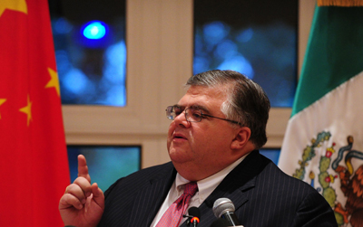墨西哥央行行長(zhǎng)阿古斯丁·卡斯滕斯16日在北京同中國官員就其競(jìng)選IMF總裁一事舉行了會(huì)談。從目前形勢(shì)看,卡斯滕斯的競(jìng)爭(zhēng)前景不容樂觀。他的支持力量主要來自拉丁美洲,除本國墨西哥外,還包括哥倫比亞、委內(nèi)瑞拉、玻利維亞、秘魯?shù)葒,總?0多個(gè)國家。而他的競(jìng)爭(zhēng)對(duì)手拉加德在歐洲廣受支持,美國和俄羅斯雖然沒有公開表態(tài),但其官員言談間流露出傾向拉加德的意味。不過,卡斯滕斯表示,他仍會(huì)堅(jiān)持競(jìng)爭(zhēng),“就像他們談及棒球比賽,比賽沒結(jié)束就不算完”。圖為當(dāng)天他在墨西哥駐華使館舉行新聞發(fā)布會(huì)時(shí)的情形。
