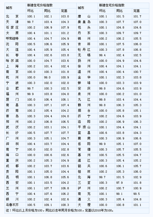 3、2011年5月份,59個城市的新建住宅價格指數(shù)根據(jù)網(wǎng)簽數(shù)據(jù)計算,其他11個城市根據(jù)統(tǒng)計系統(tǒng)房地產(chǎn)開發(fā)統(tǒng)計報表中各個項目的分類銷售面積和金額數(shù)據(jù)計算。59個網(wǎng)簽數(shù)據(jù)城市分別是:北京、天津、石家莊、太原、呼和浩特、沈陽、大連、長春、哈爾濱、上海、南京、杭州、寧波、合肥、福州、廈門、南昌、濟(jì)南、青島、鄭州、武漢、長沙、廣州、深圳、南寧、?凇⒅貞c、成都、貴陽、昆明、西安、蘭州、西寧、銀川、烏魯木齊、秦皇島、包頭、丹東、吉林、牡丹江、無錫、揚州、徐州、溫州、金華、泉州、九江、洛陽、平頂山、宜昌、岳陽、惠州、湛江、韶關(guān)、桂林、北海、三亞、瀘州、南充。5月份新增加的城市是溫州。