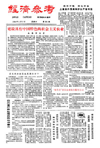 1984年1月7日,《經(jīng)濟(jì)參考報(bào)》在頭版頭條位置刊發(fā)了本報(bào)評(píng)論員文章《建設(shè)具有中國(guó)特色的社會(huì)主義農(nóng)業(yè)》,充分肯定了以聯(lián)產(chǎn)承包制為代表的農(nóng)村改革,指出這是一種很有意義的嘗試,經(jīng)過(guò)幾年的實(shí)踐考驗(yàn),證明它是成功的。