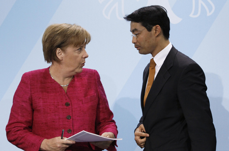 德國總理安格拉·默克爾領(lǐng)導(dǎo)的中右執(zhí)政聯(lián)盟內(nèi)部就降低稅收達(dá)成共識,定于7月6日提交內(nèi)閣審議,下一個議會選舉年著手落實。德國國際通訊社(DAPD)7月3日獲得一份備忘錄,涉及默克爾及其執(zhí)政聯(lián)盟伙伴的商議結(jié)果,但沒有提及具體減稅金額。 圖為默克爾(左)與德國經(jīng)濟(jì)部長菲利普·勒斯勒爾2011年5月16日在柏林出席新聞發(fā)布會的資料照片。