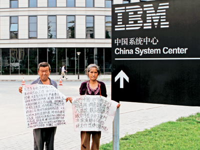 炎炎烈日將地面烤得發(fā)燙,老人卻毫不懈怠地守護(hù)著鋪在大廈臺(tái)階上的幾張發(fā)黃的硬殼紙,紙上布滿(mǎn)了密密麻麻的文字,字跡顯得有些凌亂不清,但從中卻似乎能感受到一種憤懣的情緒,尤其是“IBM”三個(gè)字力透紙背。