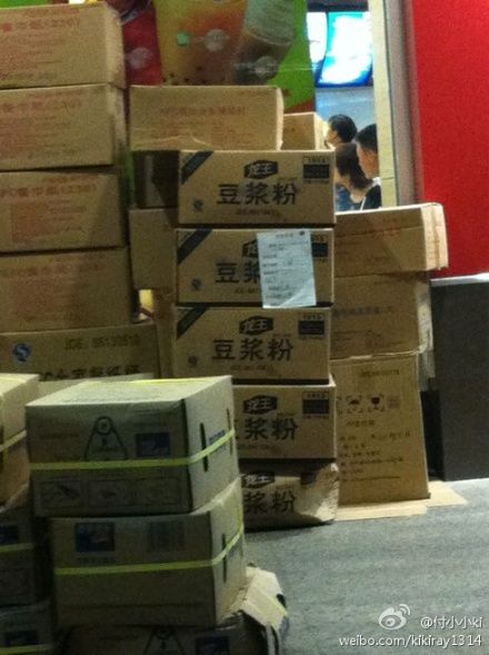 圖為網(wǎng)友曝出的肯德基門店外堆放著幾箱豆?jié){粉原料。(來源:網(wǎng)友微博上傳) |