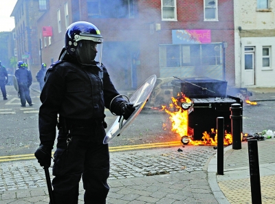 8月8日,在英國(guó)首都倫敦東部的哈克尼區(qū),警察向騷亂者推進(jìn)。8月6日晚開(kāi)始于倫敦北部托特納姆的街頭騷亂8日呈現(xiàn)蔓延趨勢(shì),倫敦多個(gè)社區(qū)出現(xiàn)打砸、縱火和搶劫行為。
