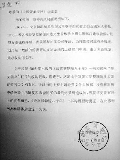 連日來,面對“私自拍賣館藏五件宋代書札”的質疑,故宮博物院方面均予堅決否認。8月5日,故宮新聞發(fā)言人馮乃恩正式向各媒體表示:“故宮博物院從未競買、收藏過網帖中所稱的5件北宋名人書札,更不存在私自拍賣藏品一說!痹撜f法與此前故宮博物院公共關系科,給予中國青年報的答復相一致。 但是,故宮博物院官方主頁的“院史編年”一欄中卻明確顯示,1998年有“收購宋人書札5件”入藏。其官方出版物《故宮博物院八十年》一書中第177頁“故宮博物院大事記”欄目下,“1997年”一欄中也明確記載:“6月18日,從瀚海拍賣公司拍得宋人書札五件。” 對這一相互矛盾的信息,故宮博物院致函中國青年報,對其官方網站及出版物中的“購入記錄”作出回應。 該回應稱,故宮博物院曾就收購富弼《兒子帖》等五件宋人書札,而與拍賣公司接洽,但在向上級部門申請時,經費未獲批復,因此收購實際上未能實現。 至于兩項購入記錄,故宮博物院稱系因當年整理公文檔案時,沒有核對最終結果所致,“我院將更正官網上的這條信息,《故宮博物院八十年》一書待再版時更正! 該函件主要內容如下: 1997年,北京翰海拍賣有限公司春季拍賣會上拍五通宋人書札。當時,著名書畫鑒定家徐邦達先生曾致函上級主管部門建議收購,經履行論證程序后,我院遂與拍賣公司接洽,當時媒體對此有所報道。動用這一數額的經費征購文物必須向上級部門申請,由于未獲批復,此項收購未實現。 關于我院2005年出版的《故宮博物院八十年》一書和官網“院史編年”欄目的收購記載,現查明,這是由于我院當年整理院史大事記查閱公文檔案時,誤以當時上報申請經費文件為依據,沒有核對所申請經費并未批復和未能購買的最終結果所造成的。我院將更正官網上的這條信息,《故宮博物院八十年》一書待再版時更正。在此感謝網友和媒體指出這一失誤。 函件落款“故宮博物院辦公室”,時間為2011年8月8日。