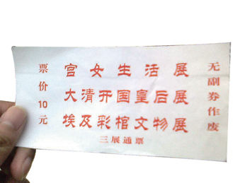 今天上午,記者趕到故宮南側的端門內,從端門往北至午門的路段兩側,楊貴妃展、中國歷代皇后展、女皇武則天展等展廳達十余家。 展覽門票價格不等,主要分為5元和10元兩種,部分展廳聯(lián)合售票,如埃及文物彩棺展、大清開國皇后展、宮女生活展等三家展廳通票為10元。 但所謂門票,其實只是一張白底的紙,類似于手撕發(fā)票,上面印著展覽主題和票價。票面沒有任何公章,也沒有主管單位的落款。 針對記者提出的報銷問題,工作人員表示,“這是內部票”,并掏出一張?zhí)彀查T城樓的票,稱可以拿回去報銷。
