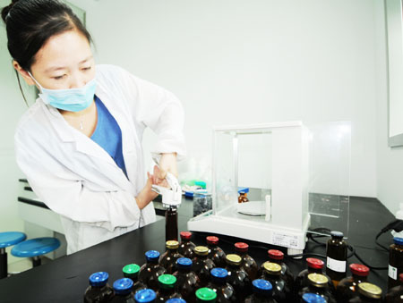 目前,蘇州生物納米科技園匯聚了超過200家各類高科技研發(fā)企業(yè)。形成了藥物研發(fā)、生物試劑、醫(yī)療器械、研發(fā)外包、納米技術(shù)等產(chǎn)業(yè)集群。圖為園區(qū)吉瑪基因公司技術(shù)人員將成品的生物醫(yī)藥制劑產(chǎn)品稱量裝瓶。新華社發(fā)