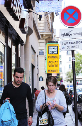 歐、美債務危機支撐金價連破新高。8月8日,人們走過位于法國巴黎街頭的黃金交易所。記者 高靜