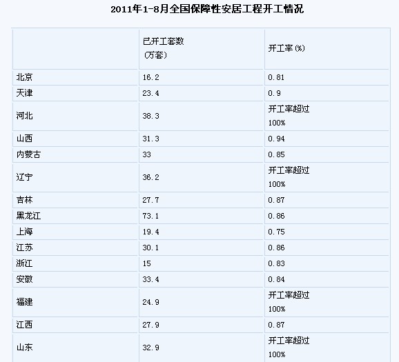 今年1-8月份,全國城鎮(zhèn)保障性住房和棚戶區(qū)改造住房已實物開工868 萬套,開工率86%(不含西藏自治區(qū))。各省、自治區(qū)、直轄市和新疆生產(chǎn)建設(shè)兵團建設(shè)進度情況見下表。另外,1-8月份各地區(qū)還新增發(fā)放廉租住房租賃補貼18萬戶。