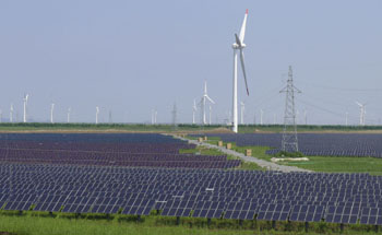 在江蘇大豐市王港南側(cè)的黃海灘涂上,成片的光伏發(fā)電組件和聳立的風(fēng)電機(jī)組交相輝映。新華社發(fā)(周古凱/攝) |