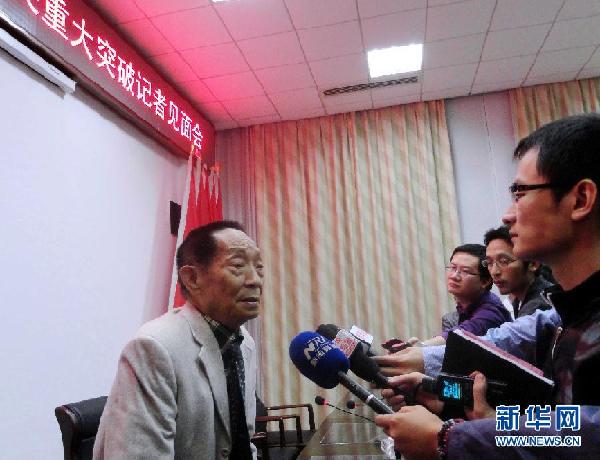 9月19日下午,在湖南省雜交水稻研究中心舉行的“超級雜交稻第三期目標(biāo)攻關(guān)重大突破記者見面會”上,袁隆平一襲白色西裝“亮相”。面對記者們“長槍短炮”的圍攻,老先生抑制不住內(nèi)心的激動和興奮。