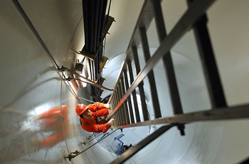 從“拼價(jià)格”到“拼質(zhì)量”,“風(fēng)馳電掣”走向世界。圖為某風(fēng)電企業(yè)工作人員在新疆達(dá)坂城風(fēng)力發(fā)電場(chǎng)風(fēng)電機(jī)組塔架里工作。記者