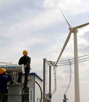 技術(shù)人員正在河北圍場(chǎng)滿族蒙古族自治縣紅松洼風(fēng)電場(chǎng)安裝風(fēng)電設(shè)備。 |