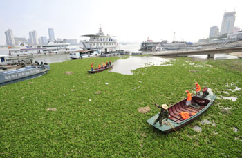 圖為8月29日武漢水上管理處清漂隊員在長江武漢段打撈水葫蘆。當時,密密麻麻的水葫蘆綿延達數(shù)十公里。新華社發(fā)(葉火生/攝) |