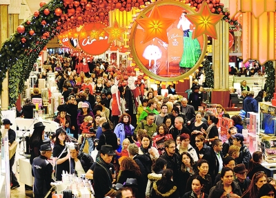 商家通常會(huì)在“黑色星期五”當(dāng)天凌晨開門營(yíng)業(yè),不少消費(fèi)者會(huì)通宵達(dá)旦地排隊(duì)搶購(gòu)數(shù)量有限的特價(jià)商品。圖為11月25日上午,美國(guó)紐約梅西百貨公司內(nèi)人潮涌動(dòng)。