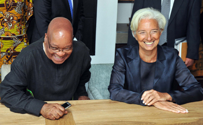 國際貨幣基金組織(IMF)總裁拉加德(右)7日與南非總統(tǒng)祖馬出席南非非洲人國民大會(huì)成立100周年紀(jì)念慶祝活動(dòng)。拉加德稱贊了南非近年來出色的經(jīng)濟(jì)表現(xiàn),但警告說“歐洲債務(wù)危機(jī)對(duì)非洲最大經(jīng)濟(jì)體帶來的風(fēng)險(xiǎn)”。